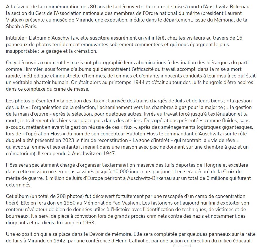 Proposée par la section gersoise de l’Association nationale des membres de l’Ordre national du mérite, une exposition intitulée « L’album d’Auschwitz » a été présentée à Mirande (Gers) du 23 au 30 septembre 2025 soit durant 7 jours ouvrables.