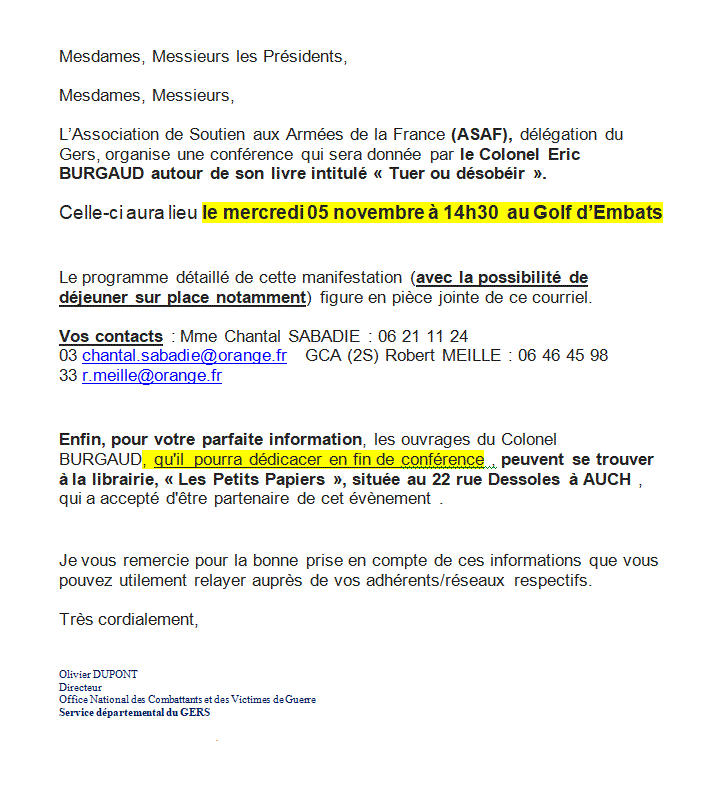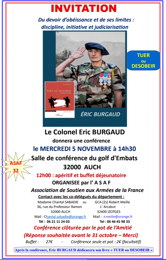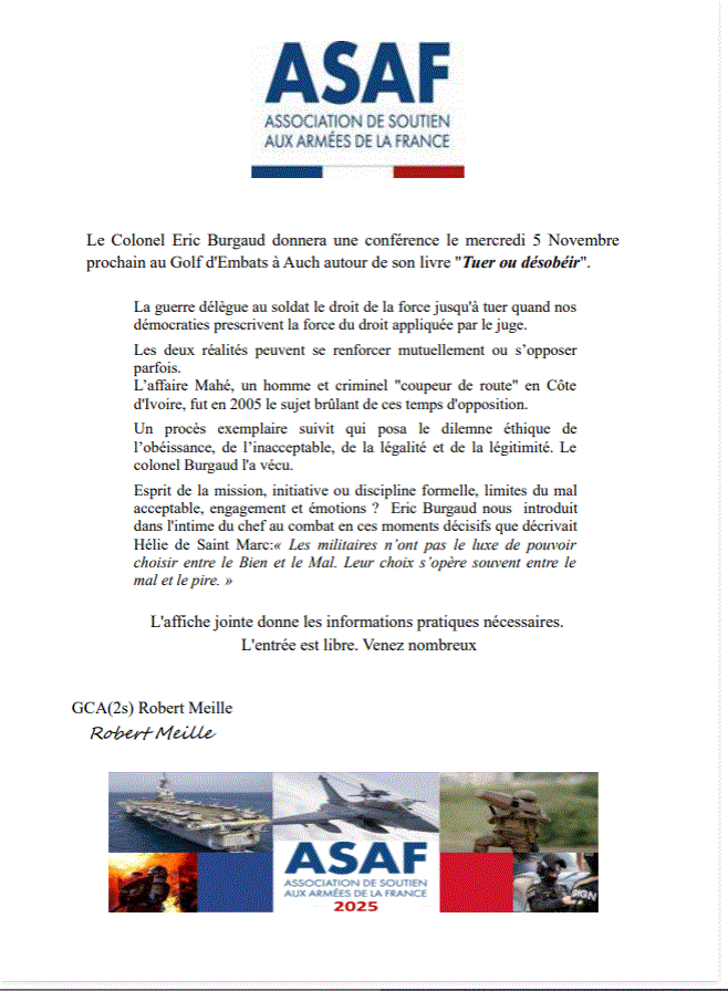 Nos amis de l'ASAF du Gers organisent au golf d'Embats à Auch le 5 novembre 2025 une conférence sur le thème "tuer ou désobéir" dilemme des militaires en opération.