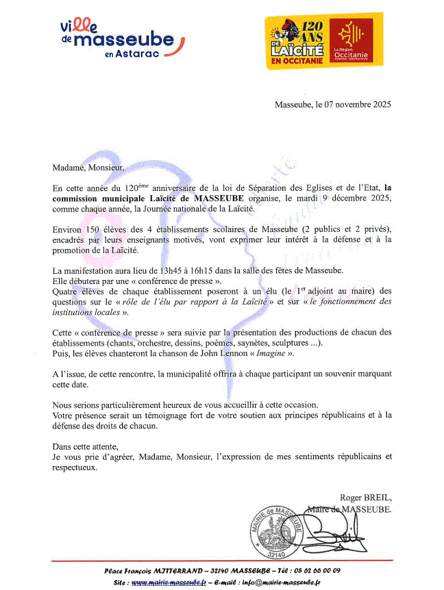 La Commission municipale Laïcité de MASSEUBE organise, le mardi 9 décembre, comme tous les ans, la Journée nationale de la Laïcité.