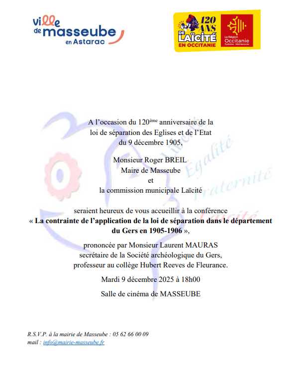Très prochainement à Masseube, la journée de la laïcité couplée à 18:00 h à une conférence sur l'application de la loi de 1905